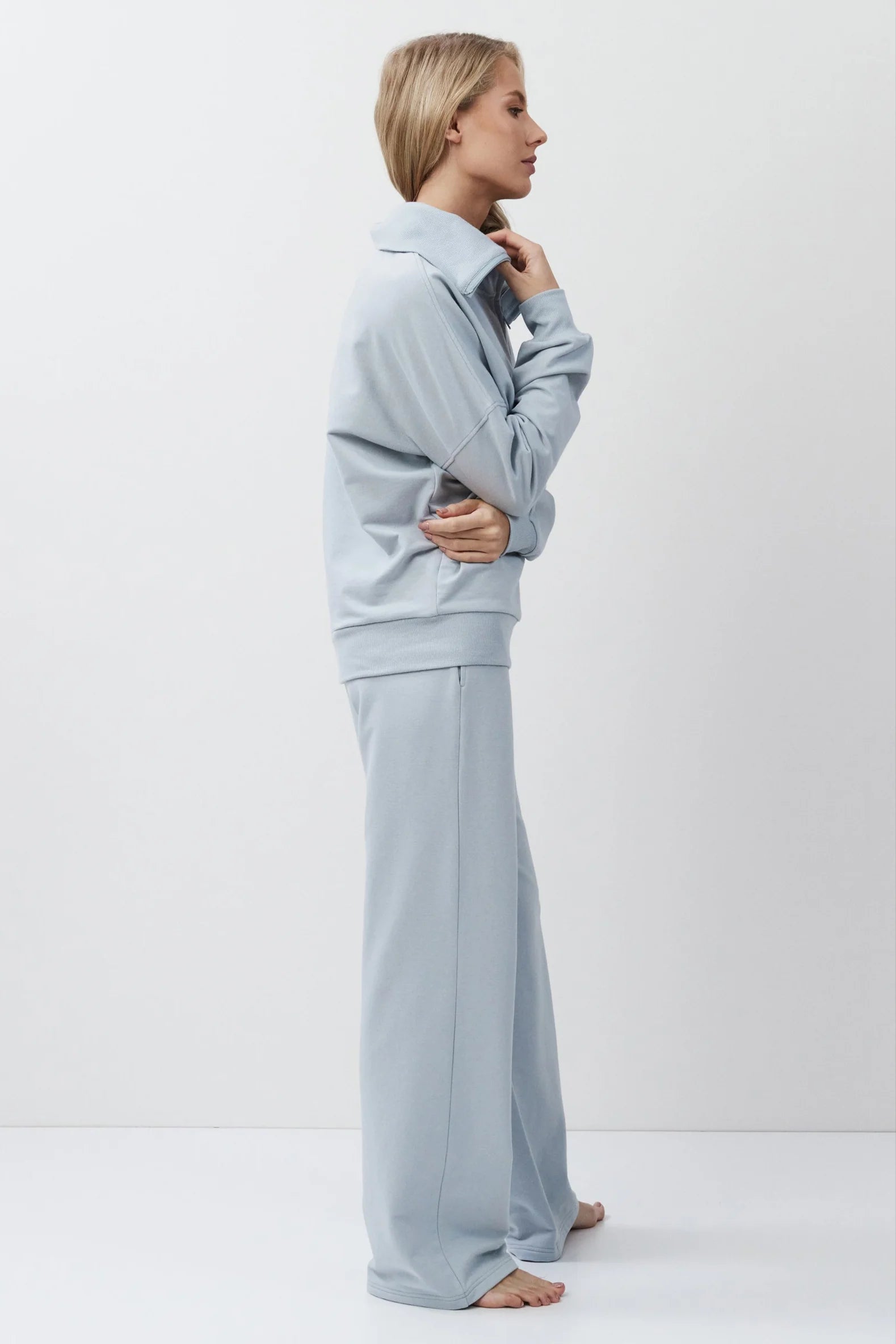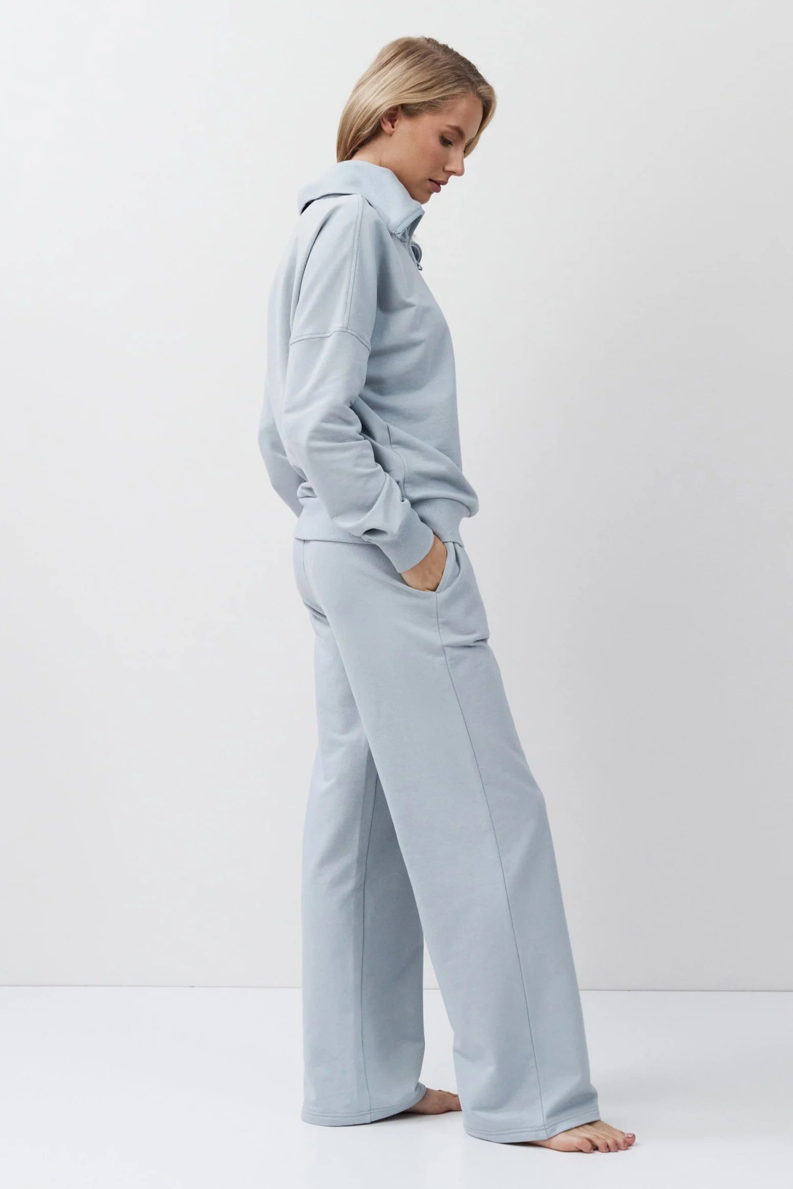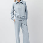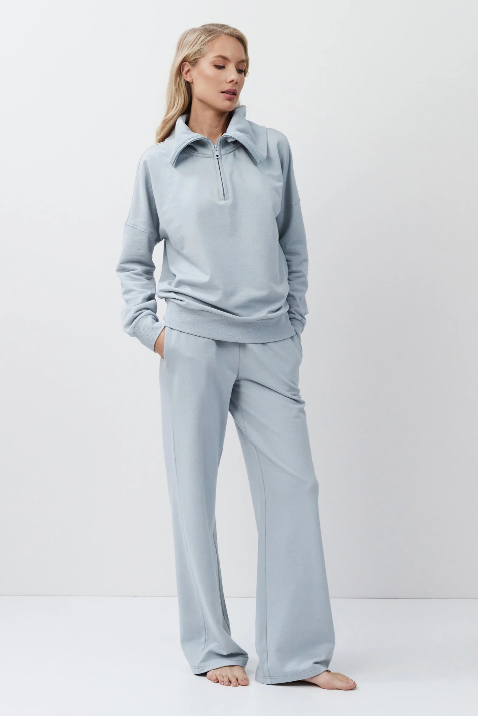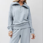 • The top features a relaxed fit with a high collar and a half-zip closure