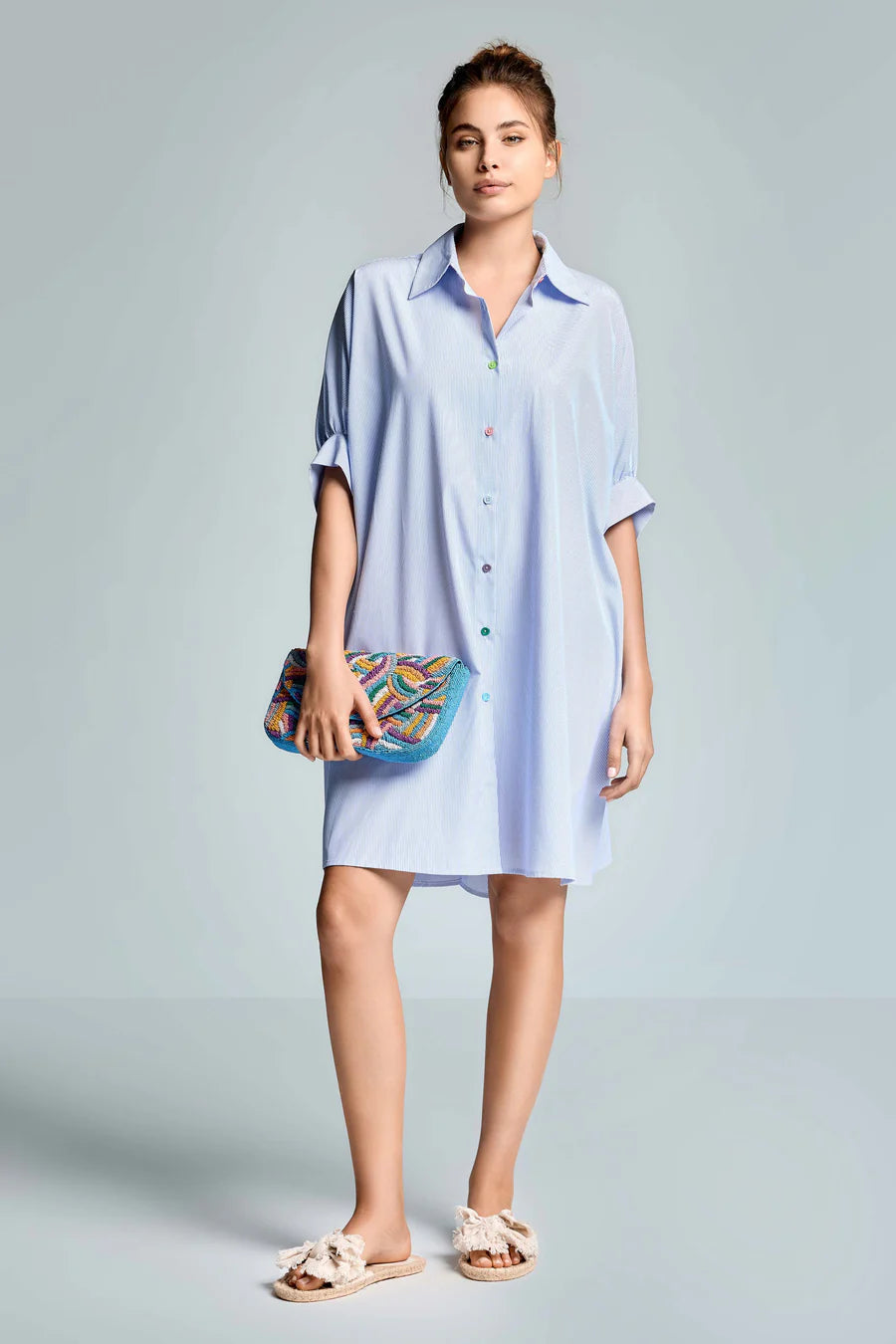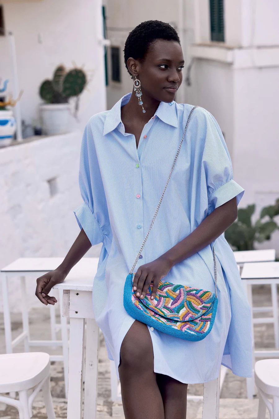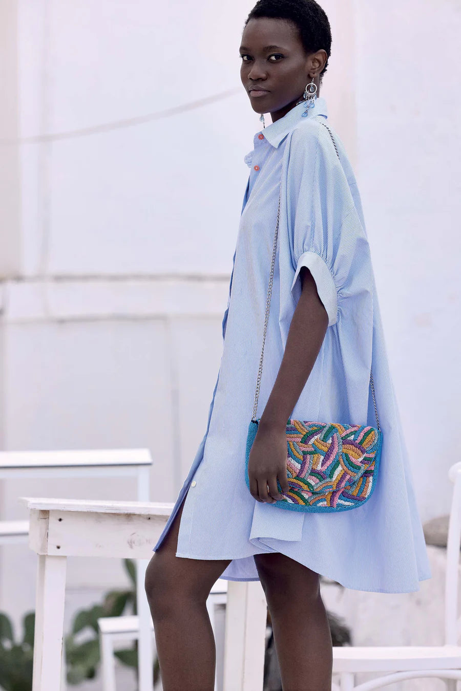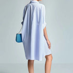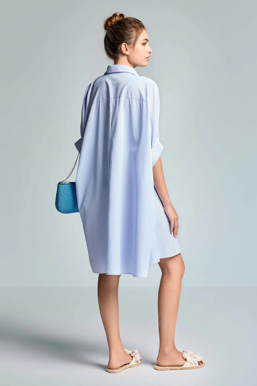 • Light blue shirt dress with voluminous sleeves for a refined, contemporary look